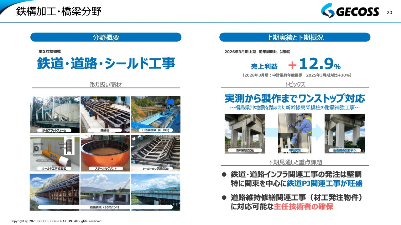 鉄構加工・橋梁分野についてです。当社が非常に注力している分野で、国土強靱化の取り組みが今後も続くと考えています。また、維持・更新・リニューアルといった需要の拡大を見据えた上でも、有望な分野と捉えています。スライド左側にお示ししているように、鉄道・道路・トンネルのシールド工事が主な領域で、取り扱い商材は掲載のとおりです。上期の実績は、売上高が若干減少しましたが、さまざまな活動が奏功し、売上利益は前年同期比で約13パーセント増となりました。