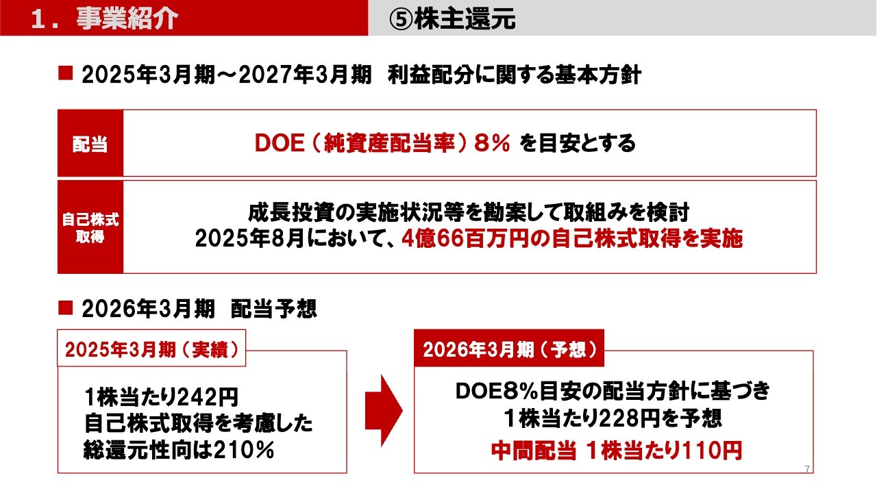 株主還元については、2025年3月期から2027年3月期において、より積極的かつ安定的な配当を実現するために、DOE(純資産配当率)を新たな指標として導入し、8パーセントを目安とすることにしています。