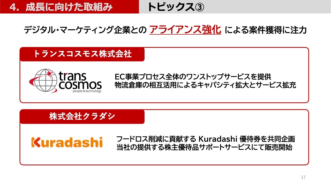 昨年度に業務提携を発表したデジタルマーケティング企業との協業による案件獲得にも注力しています。