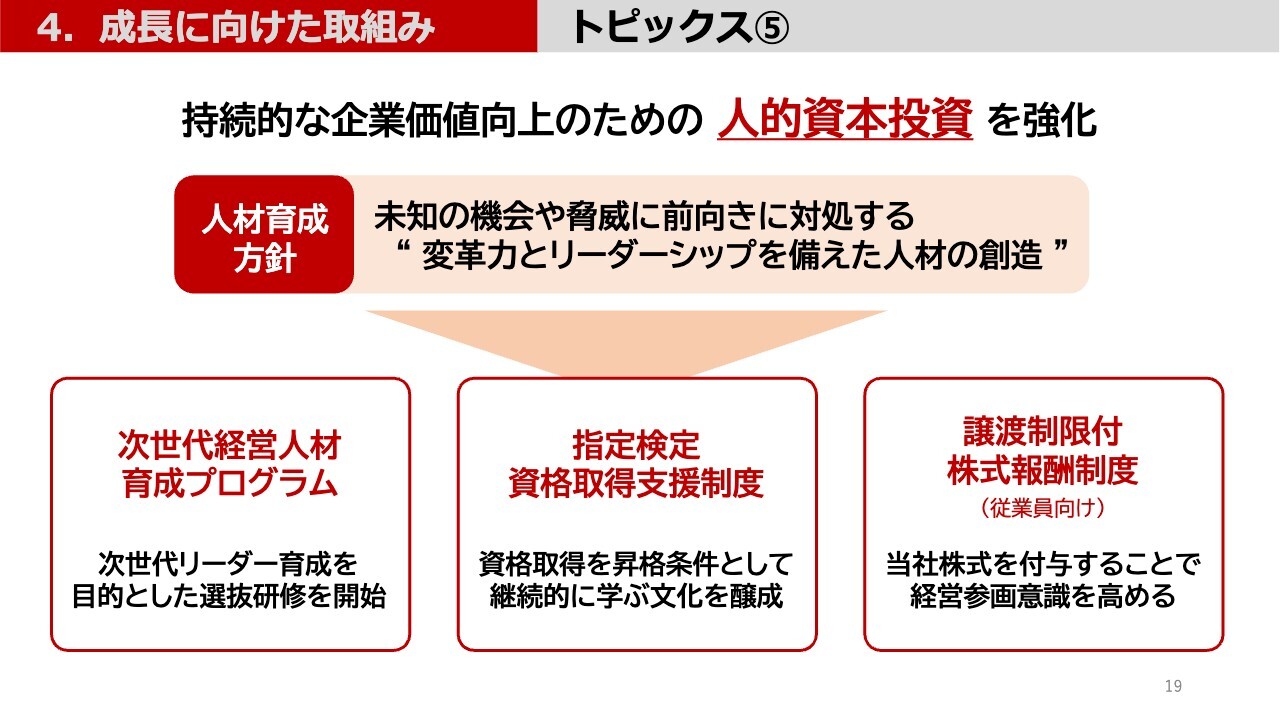 また、従業員の経営参画意識の醸成や、持続的な企業価値向上を目的として、従業員向けの譲渡制限付株式報酬制度を導入しました。これにより、従業員における株価への関心や業績向上意識が高まり、これまで以上に意欲的に業務遂行に取組むことを期待しています。
