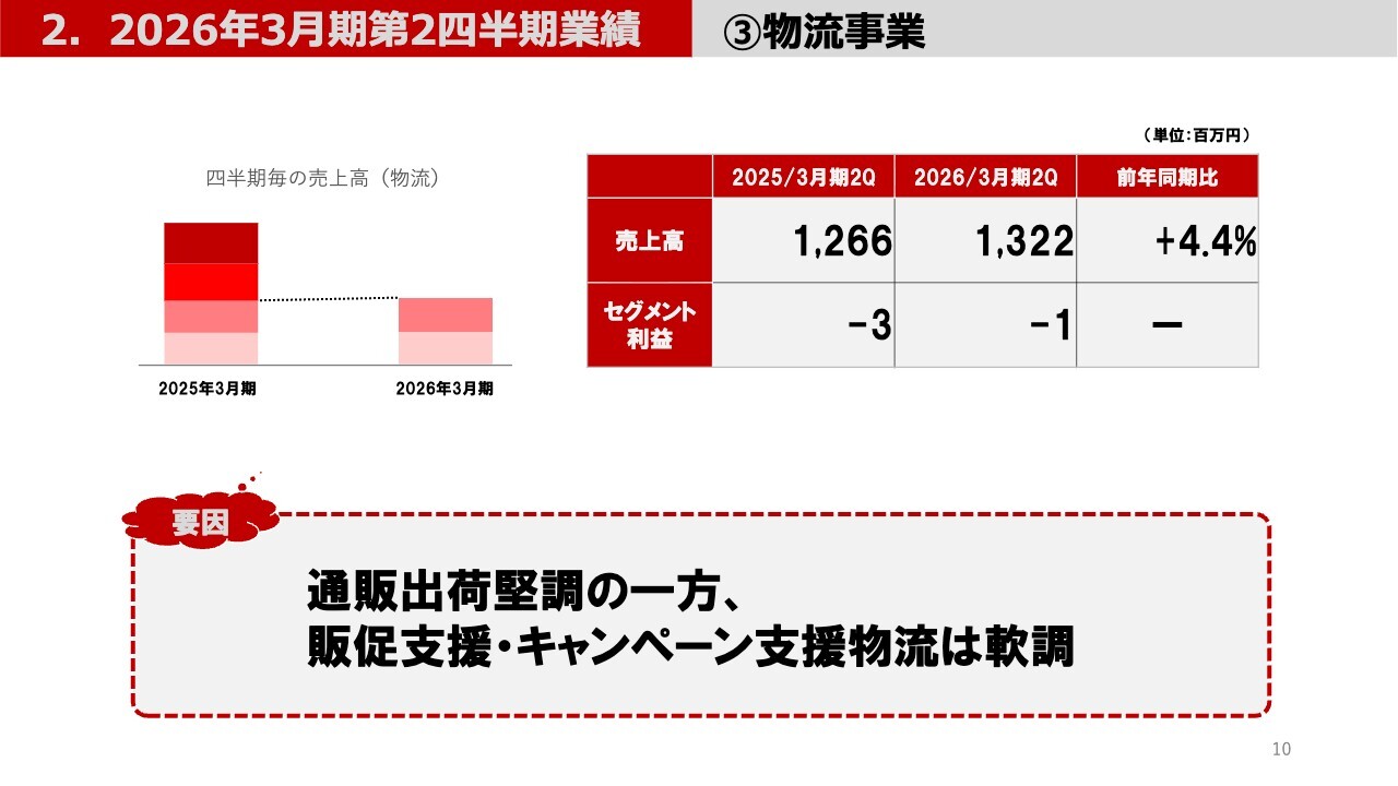 物流事業では、EC市場の拡大を背景に、通販出荷案件の取扱い数が堅調に推移したことで増収となりましたが、高採算が見込まれる販促活動やキャンペーンの支援案件の取扱いは減少しました。
