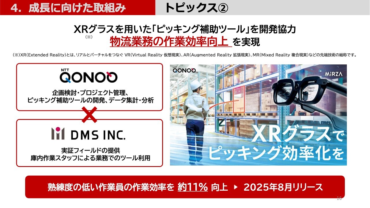 次に、物流事業の取組みです。当社と株式会社NTTコノキューは、仮想現実を利用したXRグラスによる「ピッキング補助ツール」を業界で初めて開発し、物流倉庫におけるピッキング作業の効率向上を図る実証実験を行いました。