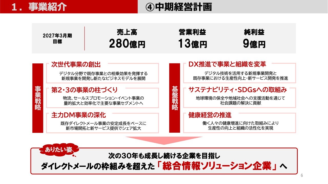 当社ではこのような取組みを背景に、2027年3月期を最終年度とする中期経営計画において、売上高280億円、営業利益13億円、純利益9億円の達成を目指しています。