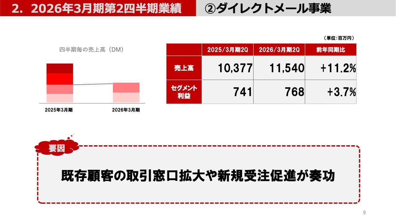 まず、ダイレクトメール事業では、既存顧客への取引窓口拡大や新規受注促進が奏功したことで増収増益となりました。