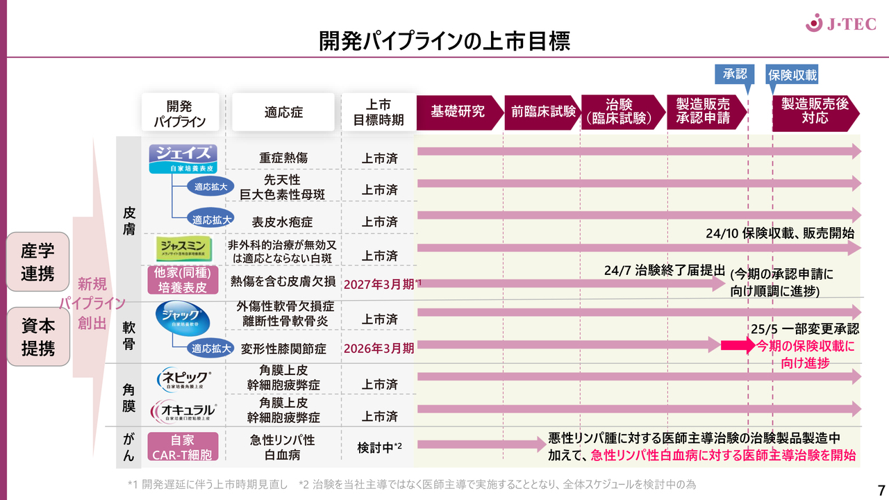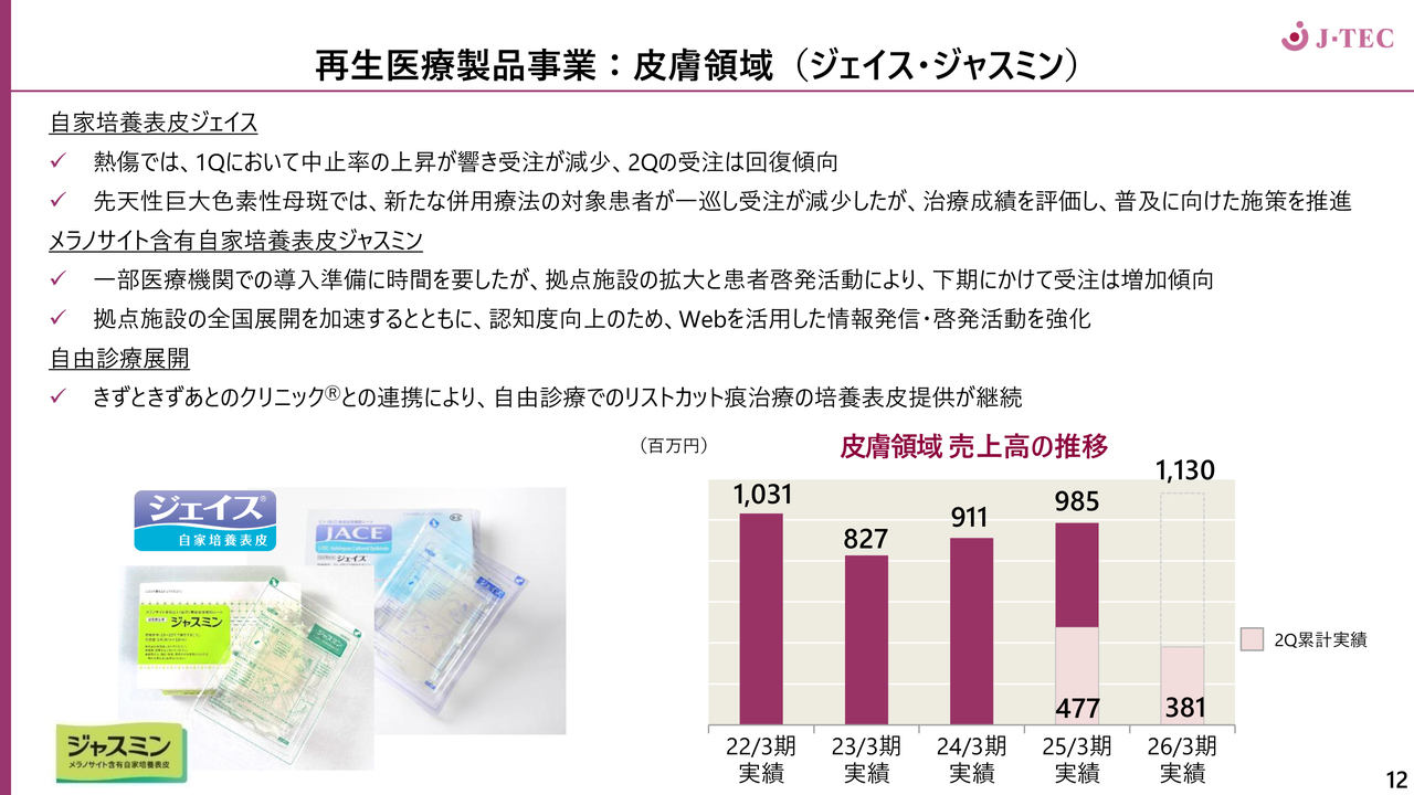 皮膚領域の「ジェイス」については直近で復調傾向にあります。同種培養表皮「Allo-JaCE03」については、今年度中の承認申請を目指して順調に進捗しています。さらに、自由診療における「きずときずあとのクリニック」のリストカット痕治療についても、引き続き培養表皮を提供しています。