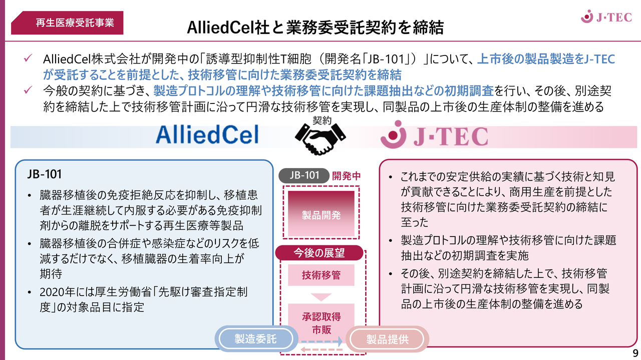 再生医療受託事業におけるトピックです。直近では、AlliedCel社との業務委託契約を締結しました。これまで当社は、治験製品を受託してきましたが、新たなステップとして、AlliedCel社が開発中の「誘導型抑制性T細胞(開発名「JB-101」)」について、上市後の製品製造を当社が担うことを前提に、技術移管を目的とした業務委託契約を締結しました。