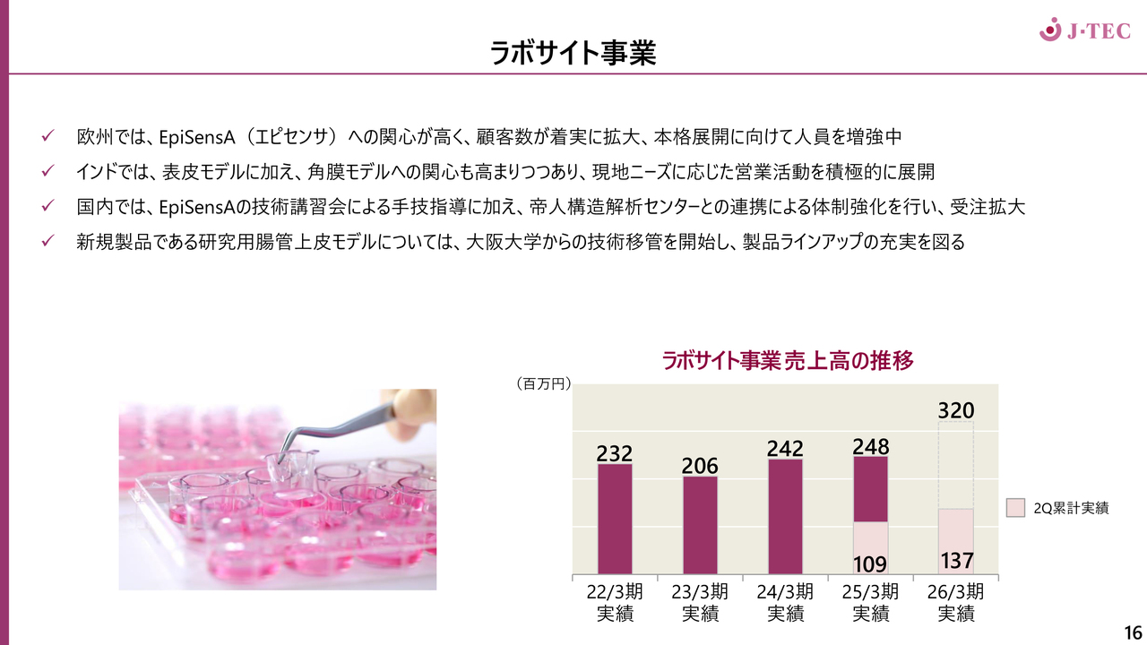 ラボサイト事業については、国内外の新規顧客を順調に獲得しています。2026年度に上市予定の研究用腸管上皮モデルについても、技術移管を7月から開始しました。