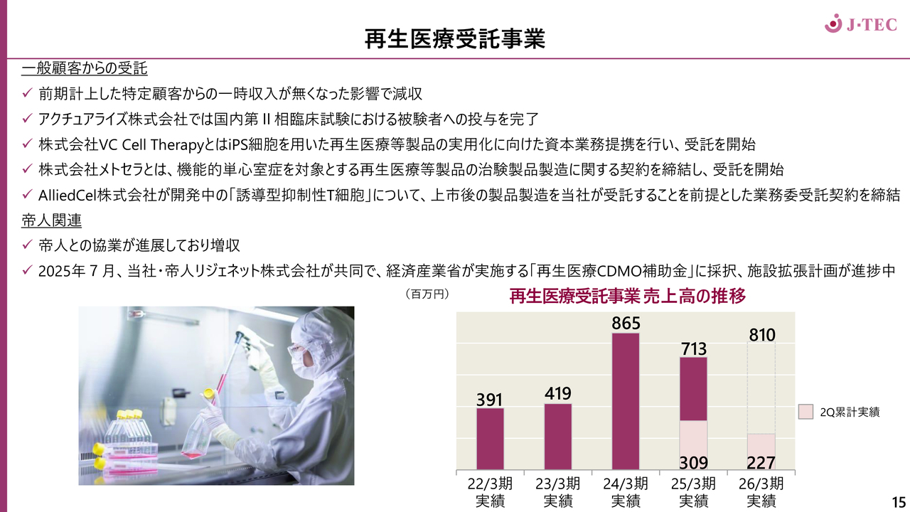 再生医療受託事業についてご説明します。一般顧客からの受託については、特定顧客からの一時的な収入は今年度第2四半期の時点ではありませんでしたが、アクチュアライズ社に加え、昨年度に資本業務提携を行ったVC Cell Therapy社とも連携し、受託を進めています。