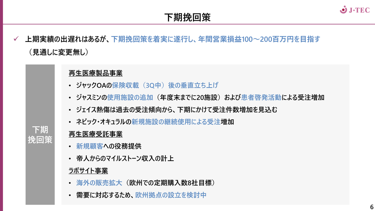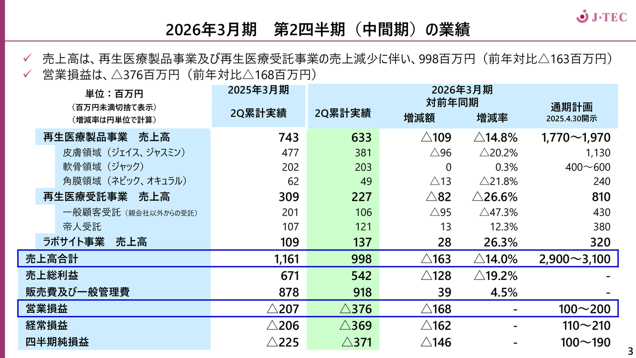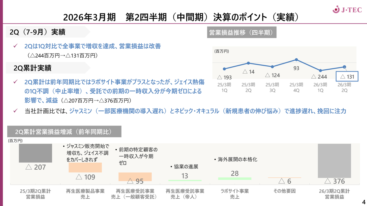 この中間期の営業損益については、再生医療製品事業の売上において「ジャスミン」の販売開始による増収の一方で、「ジェイス」の不調を補い切れませんでした。再生医療受託事業についても、先ほどご説明したとおり、特定の顧客からの一時収入がゼロだったことが影響しています。