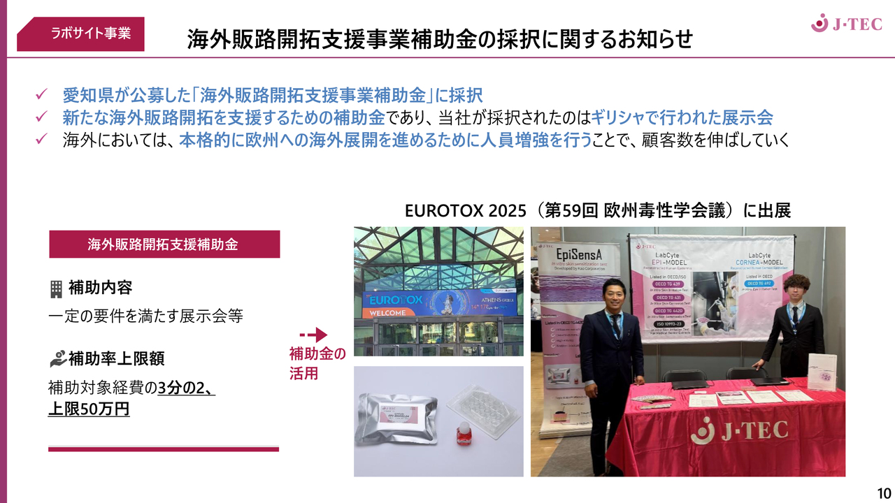 また、ラボサイト事業において、愛知県が公募した「海外販路開拓支援事業補助金」に採択されています。この補助金は補助対象経費の3分の2が補助され、上限は50万円です。