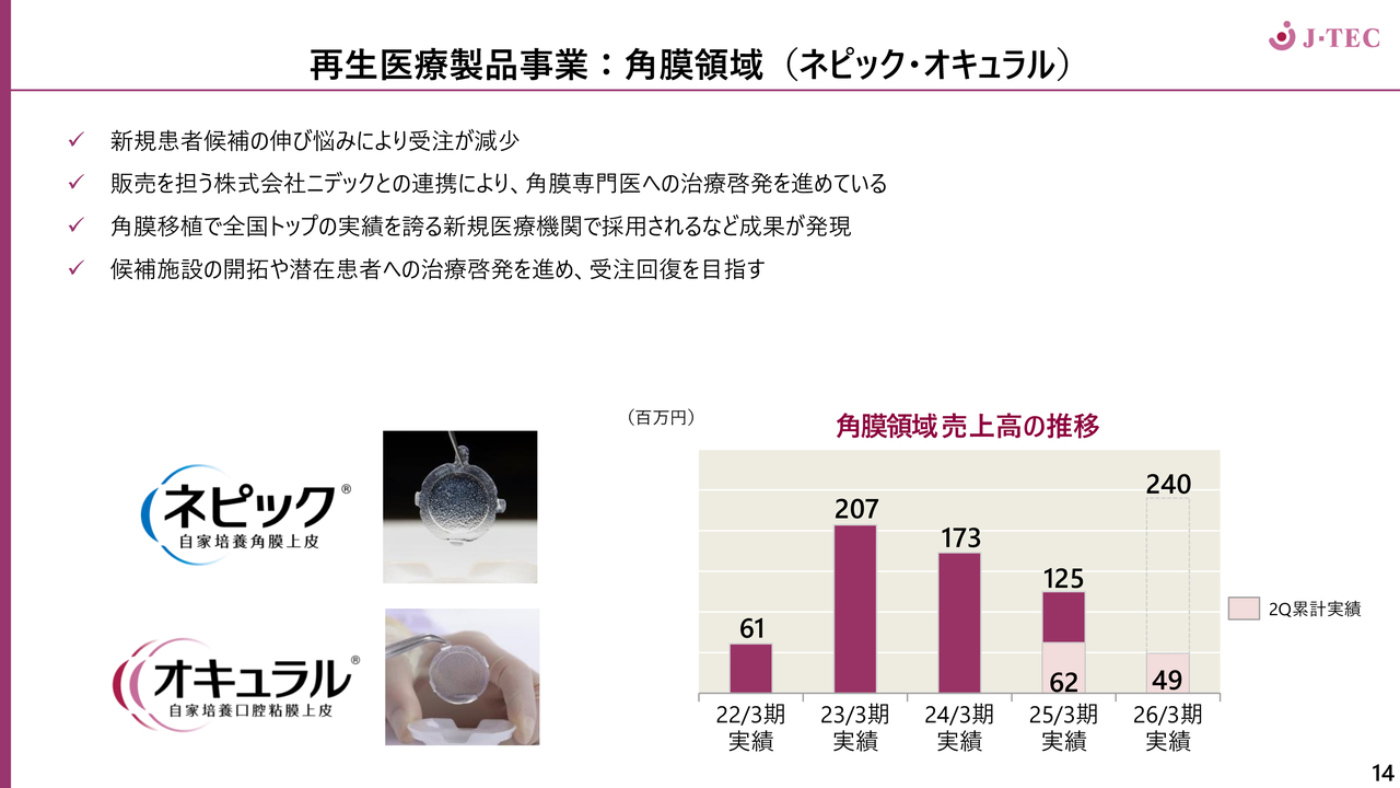 続いて、再生医療製品事業の角膜領域「ネピック」「オキュラル」についてです。新規患者候補の伸び悩みはありますが、販売を担うニデック社と連携し、角膜専門医による治療啓発を進めています。