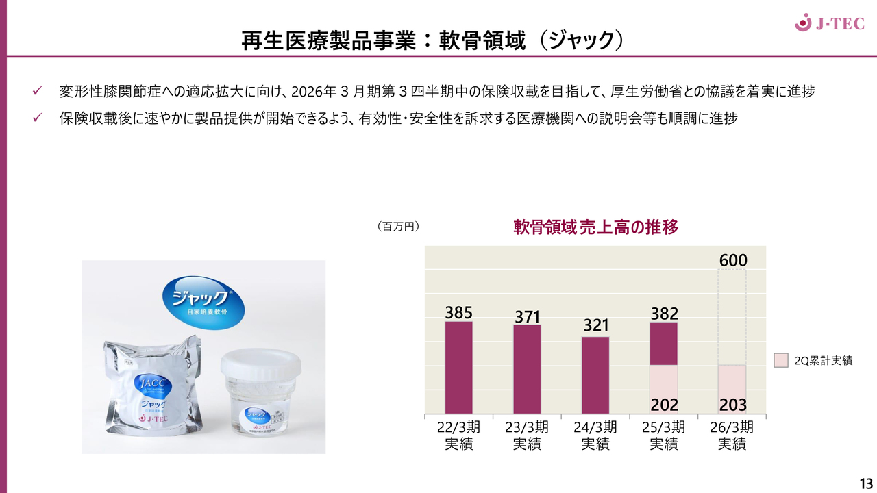 軟骨領域については、「ジャック」の変形性膝関節症への適応拡大に関して、今期第3四半期の保険収載を目指し、厚生労働省との協議が着実に進捗しています。保険収載後の提供体制の構築も順調に進めています。