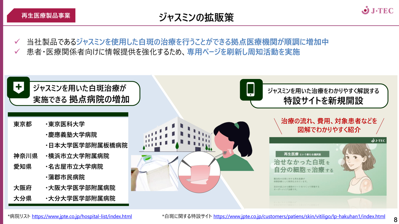 ここからは、「ジャスミン」の拡販策についてさらに詳細にご説明します。「ジャスミン」を用いた白斑治療が実施可能な拠点病院は、東京都で3施設、神奈川県で1施設、愛知県で2施設、大阪府で1施設、九州では大分県で1施設と8施設まで拡大しました。