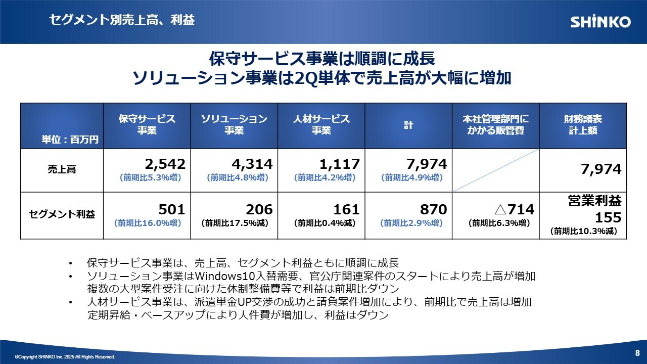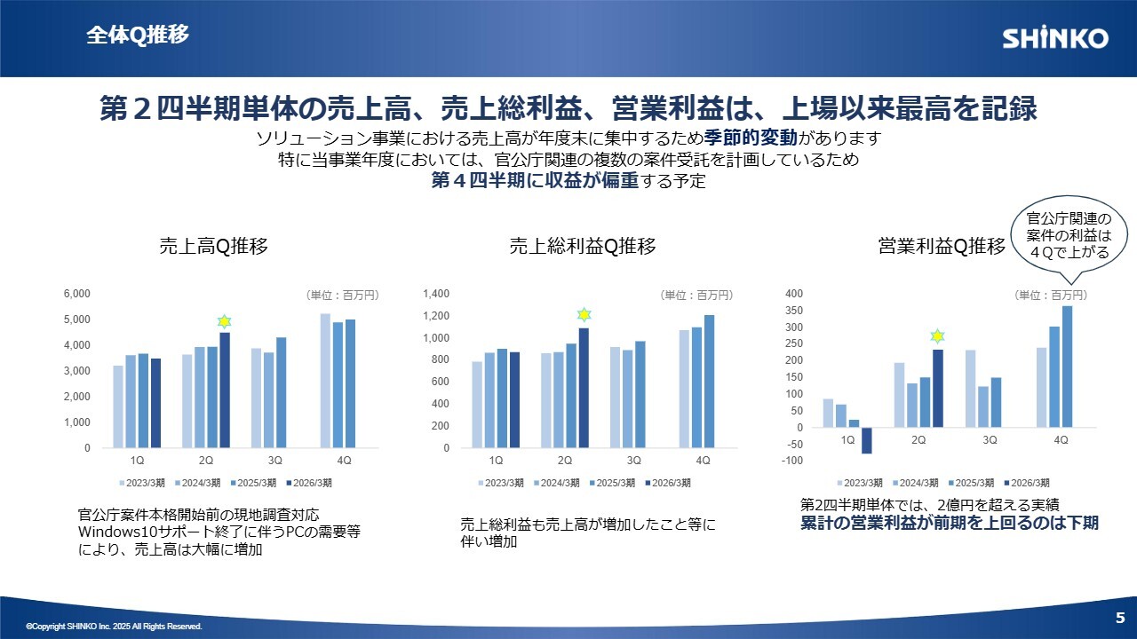 【QAあり】SHINKO、2Q単体の売上高・売上総利益・営業利益は上場来最高を記録 ソリューション事業の売上高が大幅増加