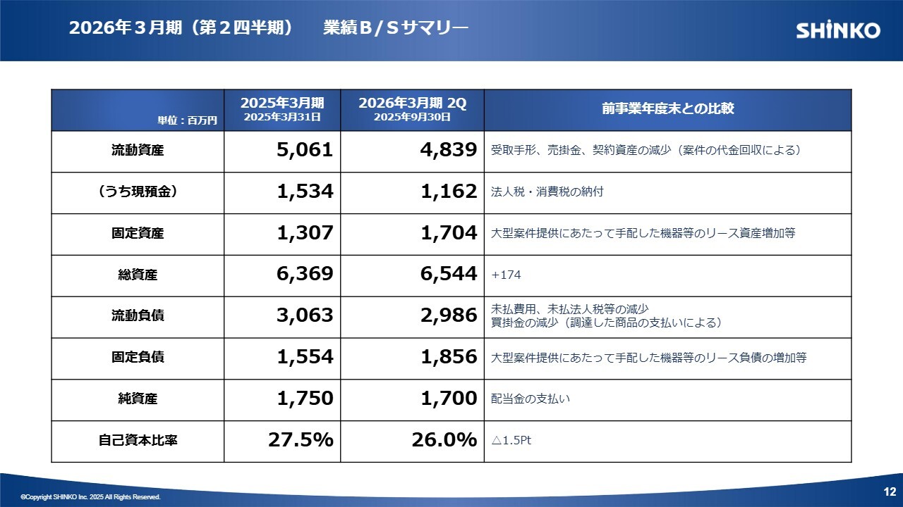 2026年3月期(第2四半期) 業績B/Sサマリー