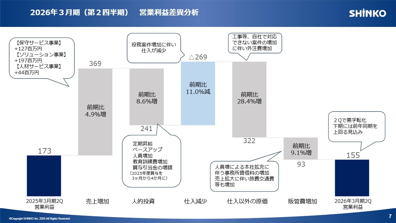 本社事務所の拡張や従業員の待遇改善などの取り組みにより、人件費や販売費及び一般管理費が増加し、前年同期と比べると利益は減少しています。ただし、第2四半期は計画以上の進捗となっており、下期では複数の大型案件の受注を予定しているため、通期では業績予想どおり増収増益で着地する見込みです。