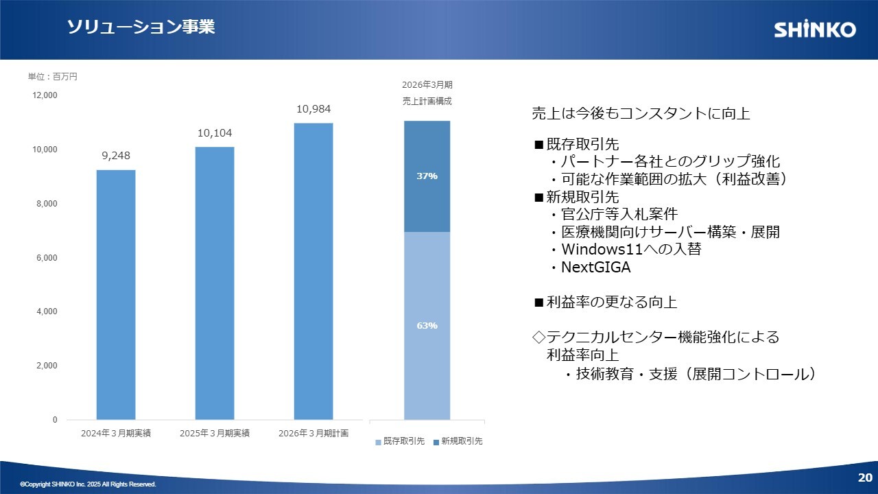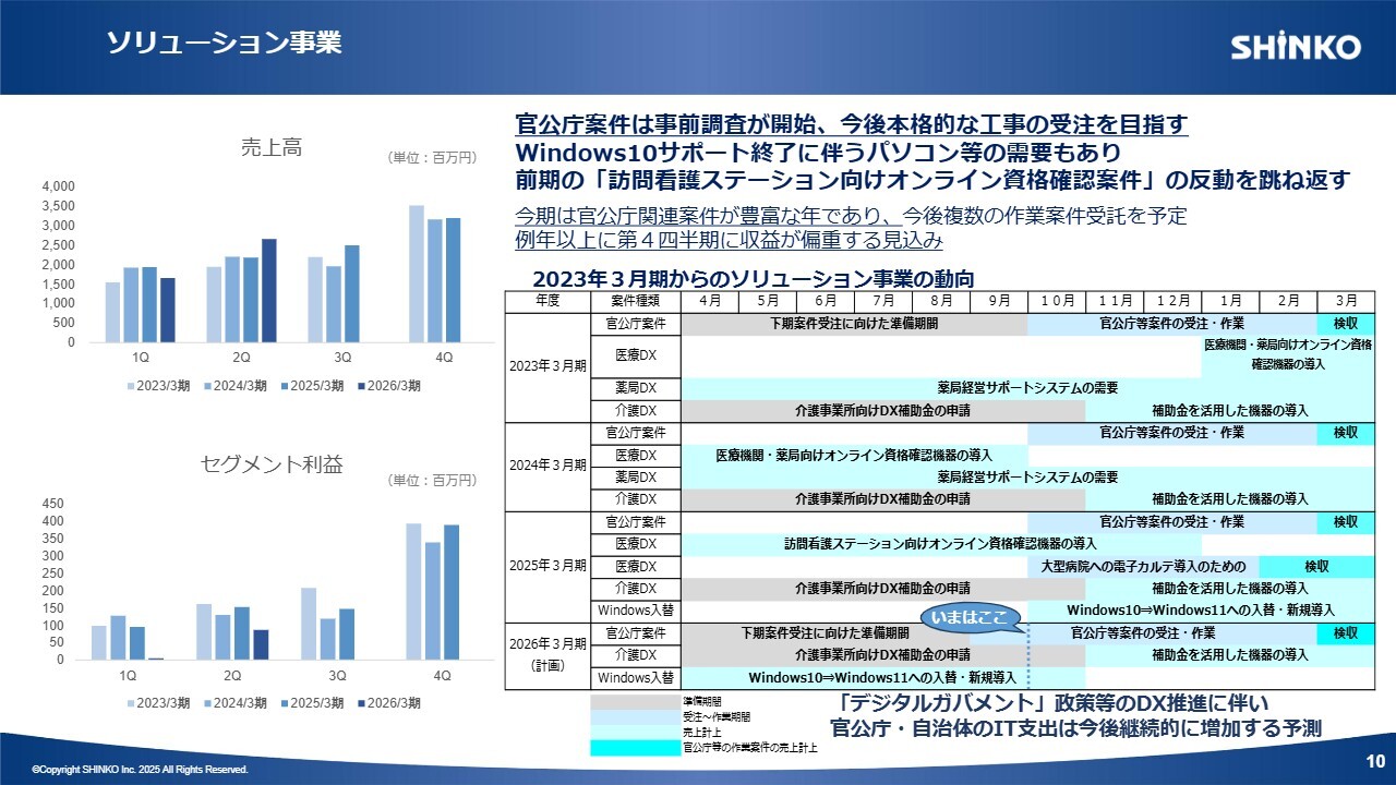 もう1つの方向性としては、新たな取引先を増やす取り組みを進めつつ、事業の拡大に取り組んでいます。ソリューション事業については、官公庁案件の需要がこれまでになく高まっていると認識しています。特にデジタル庁関連の大型案件のうち、取引先が落札した案件で、調査や準備などさまざまなかたちでお手伝いを始めたところです。これらを着実に受注につなげ、今期のソリューション事業の拡大を目指していきます。