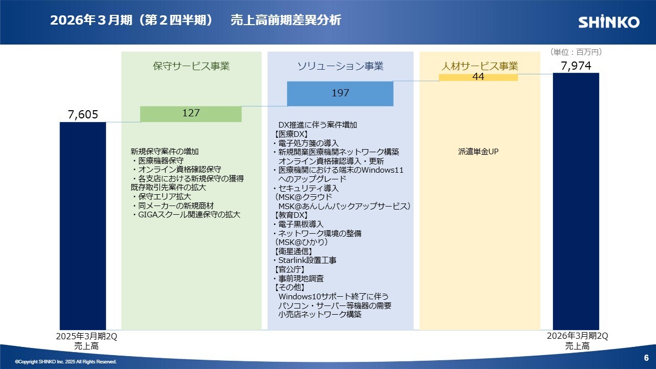 前年同期の売上高との差異分析です。保守サービス事業は堅調に成長しています。ソリューション事業はDXに伴う案件の増加により大きく伸びています。また、単価の向上などの交渉を重ねた結果、人材サービス事業も成長しています。人材サービス事業では需要が多く見込まれるため、今後も人員を増やす計画です。