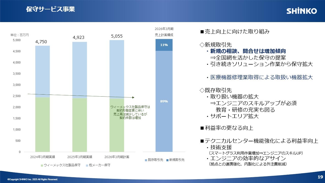 ソリューション事業から保守へつながる案件や、テクニカルセンターの見学をきっかけに、今期も新規の保守契約につながるケースが多数出ています。今後も引き続き、当社の安定基盤として保守サービス事業を成長させていきたいと考えています。