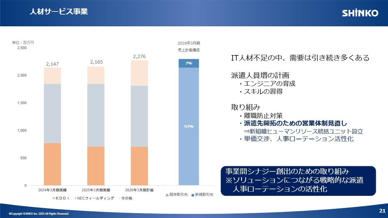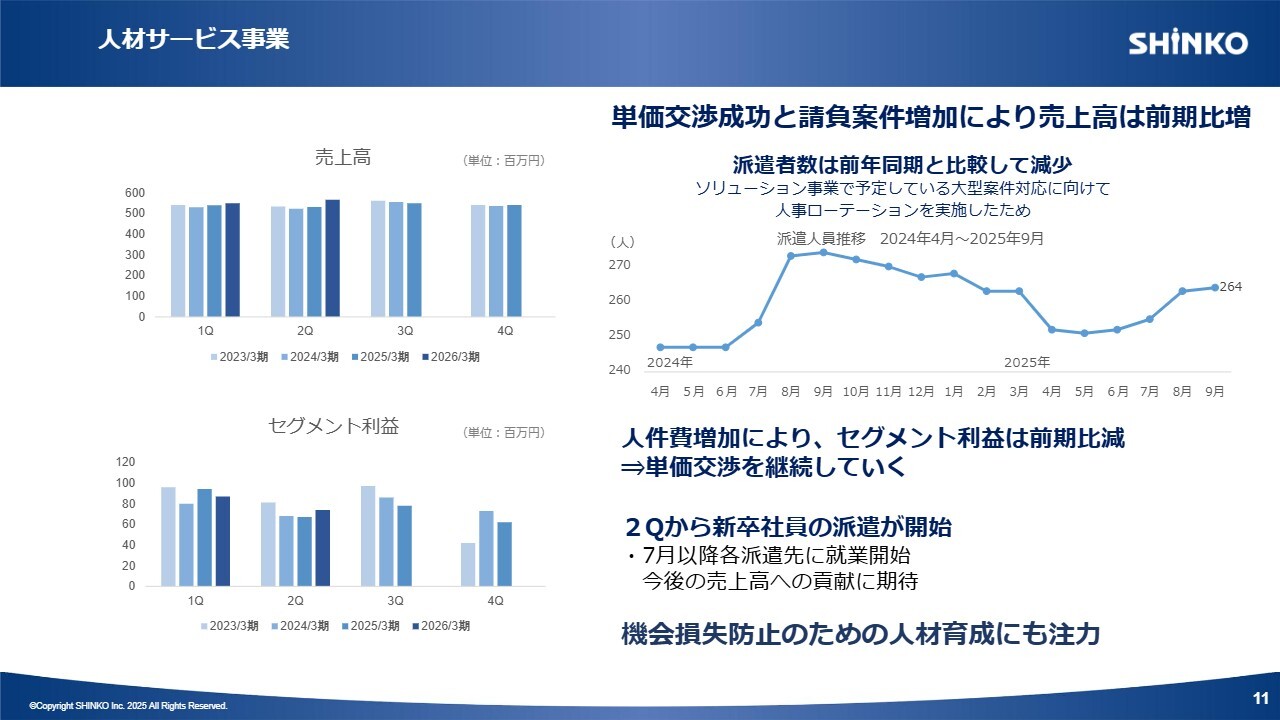 なお、派遣者数は前年同期と比較して減少しています。これは今期大型案件を受注する予定に伴い、体制整備を目的とした人事ローテーションを派遣者側で実施したためです。
