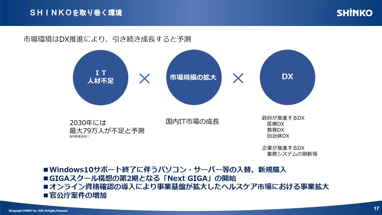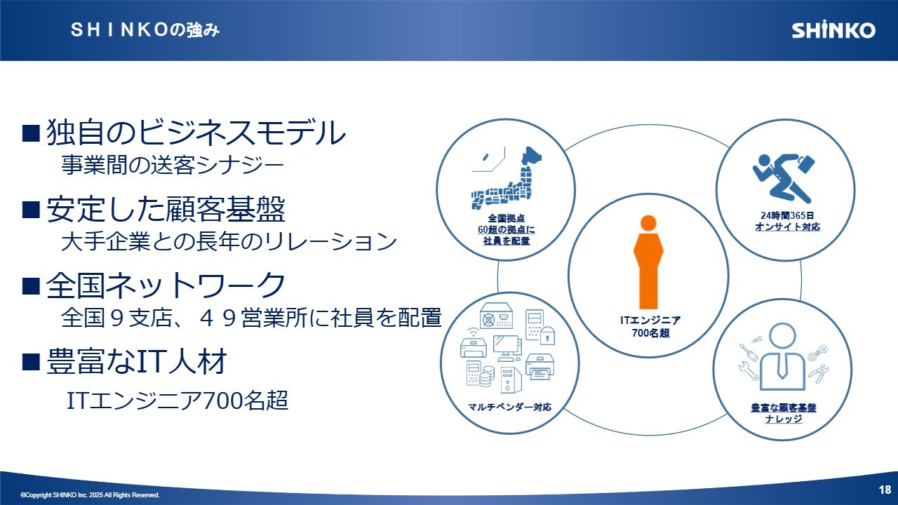 当社は、このような市場環境およびSHINKOの強みを活かしながら成長を目指しています。事業間の送客シナジーを活かした独自のビジネスモデル、大手企業との長年のリレーションによる安定した顧客基盤、全国60以上の拠点による全国ネットワーク、700名を超える豊富なIT人材を組み合わせることで、当社の事業はさらに拡大していくと予測しています。