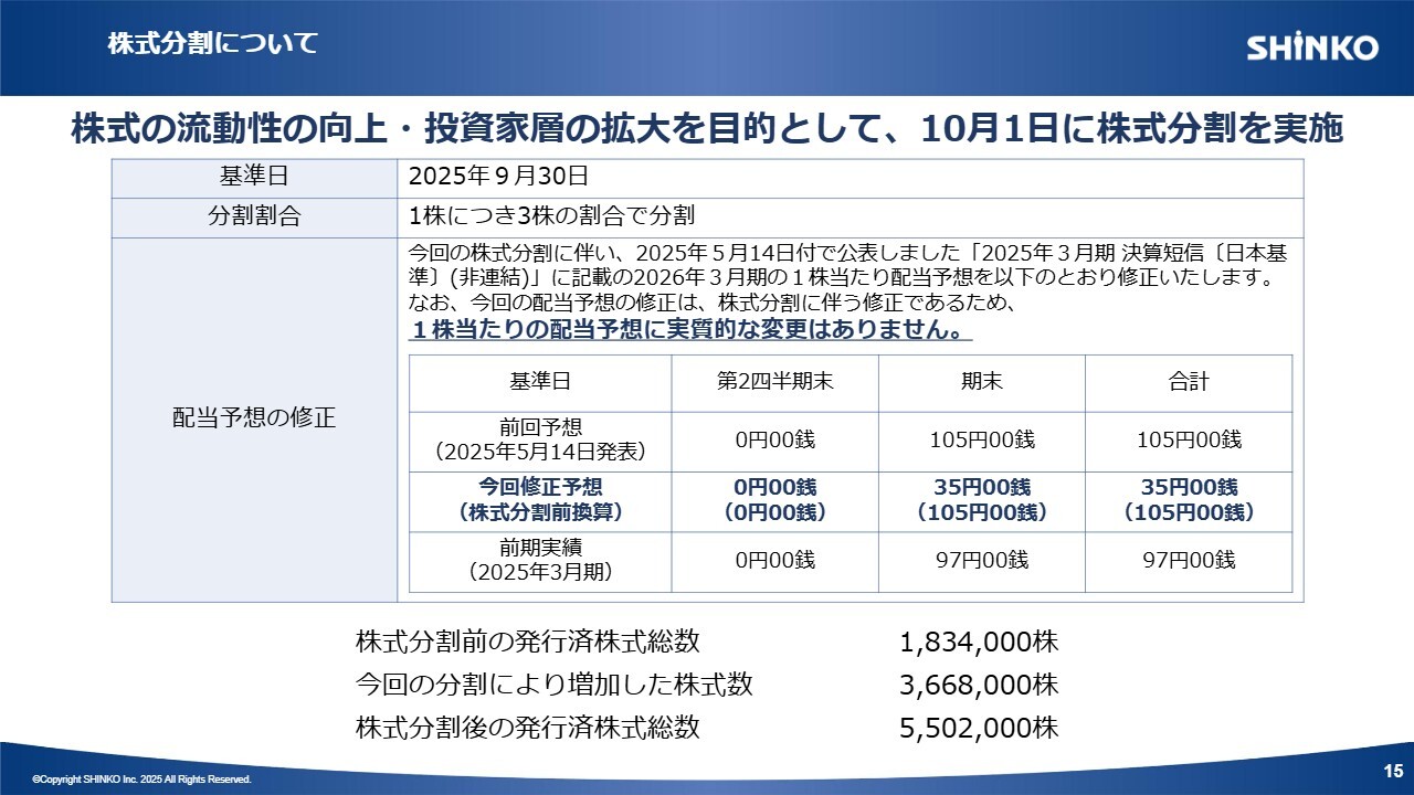 株式分割についてご説明します。10月1日付で、1対3の割合で株式分割を実施しました。詳細はスライドに記載しているとおりです。なお、株式分割による配当予想の修正はありません。期初に今期の配当を105円と発表しましたが、3分割後は35円となり、分割前に換算すると同額 です。