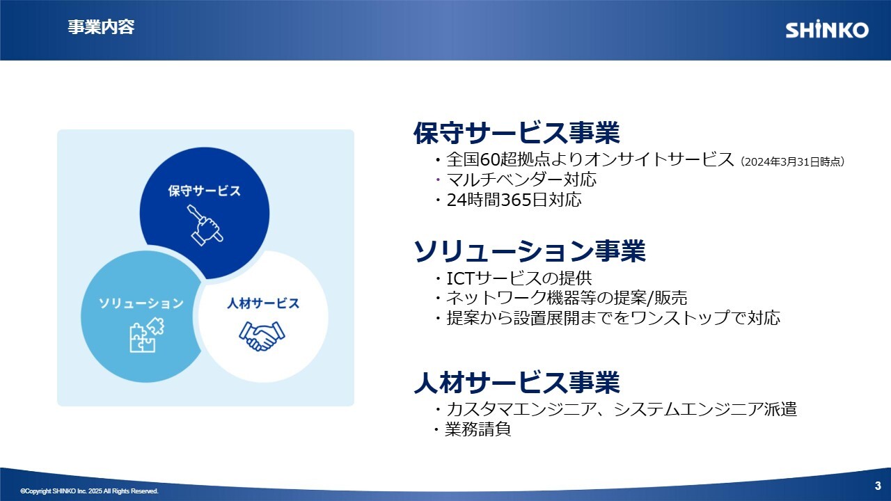 まず、株式会社SHINKOについて簡単にお話しします。当社は1953年に創業し、今年で72周年を迎えました。事業内容としては、保守サービス事業、ソリューション事業、人材サービス事業の3事業を展開しています。