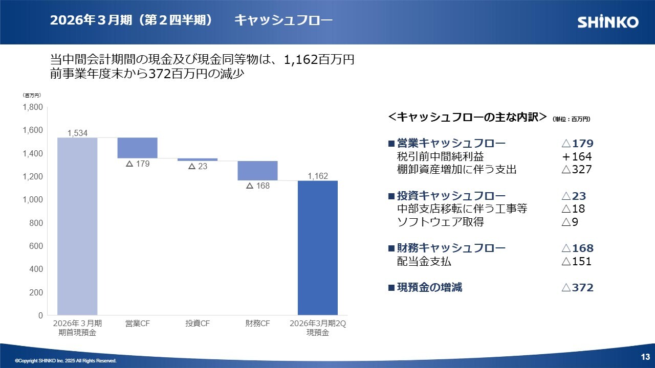 投資キャッシュフローでは、中部支店の移転に伴う工事費用や勤怠管理システムのクラウド化による支出がありました。また、財務キャッシュフローでは配当金の支払いによる支出が発生しています。これにより、現預金は3億7,200万円減少しました。