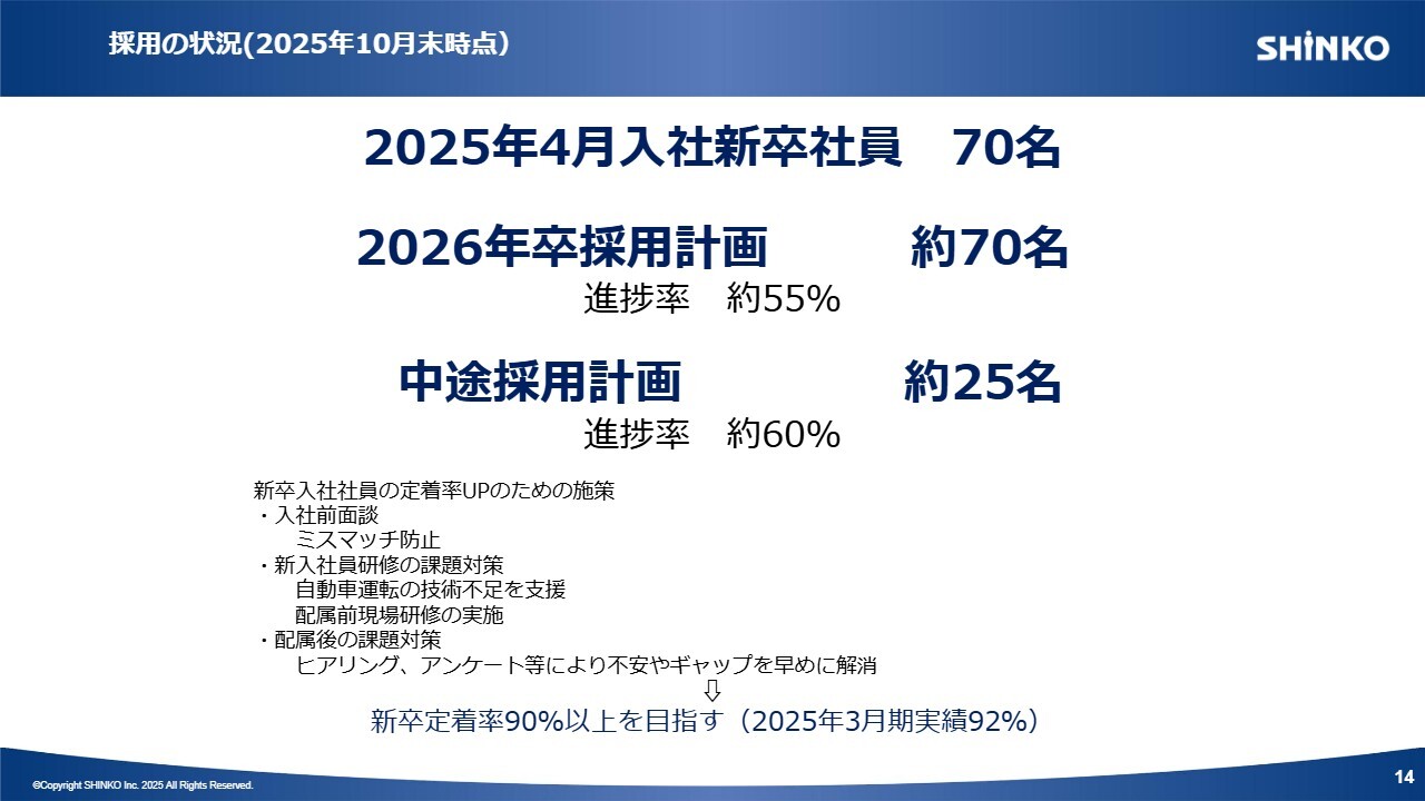 2026年の新卒採用計画は70名を予定しており、現在の進捗率は約55パーセントです。中途採用については進捗率約60パーセントと、順調に進んでいます。