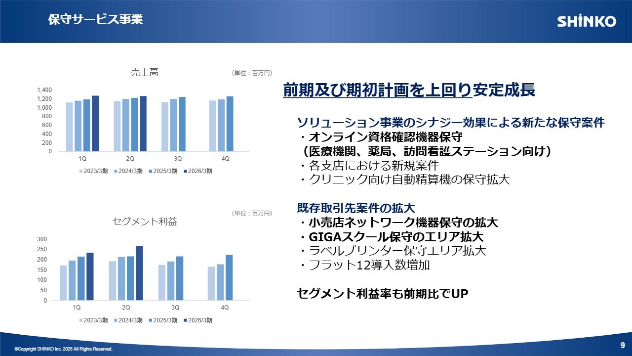 オンライン資格確認機器導入後の保守が、過去2年間増加しています。また、小売店の新店舗開店に伴う需要が継続しており、ネットワーク整備後の保守にも対応しています。さらに、GIGAスクール関連では、これまで受託している保守区画に新たな区画が追加され、規模が拡大しています。