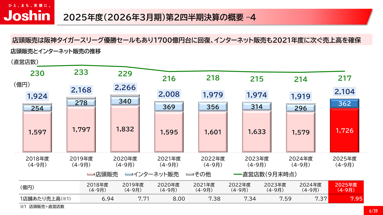 続いて6ページをご覧ください。6ページは、店頭販売及びインターネット販売における、上期の業績推移です。