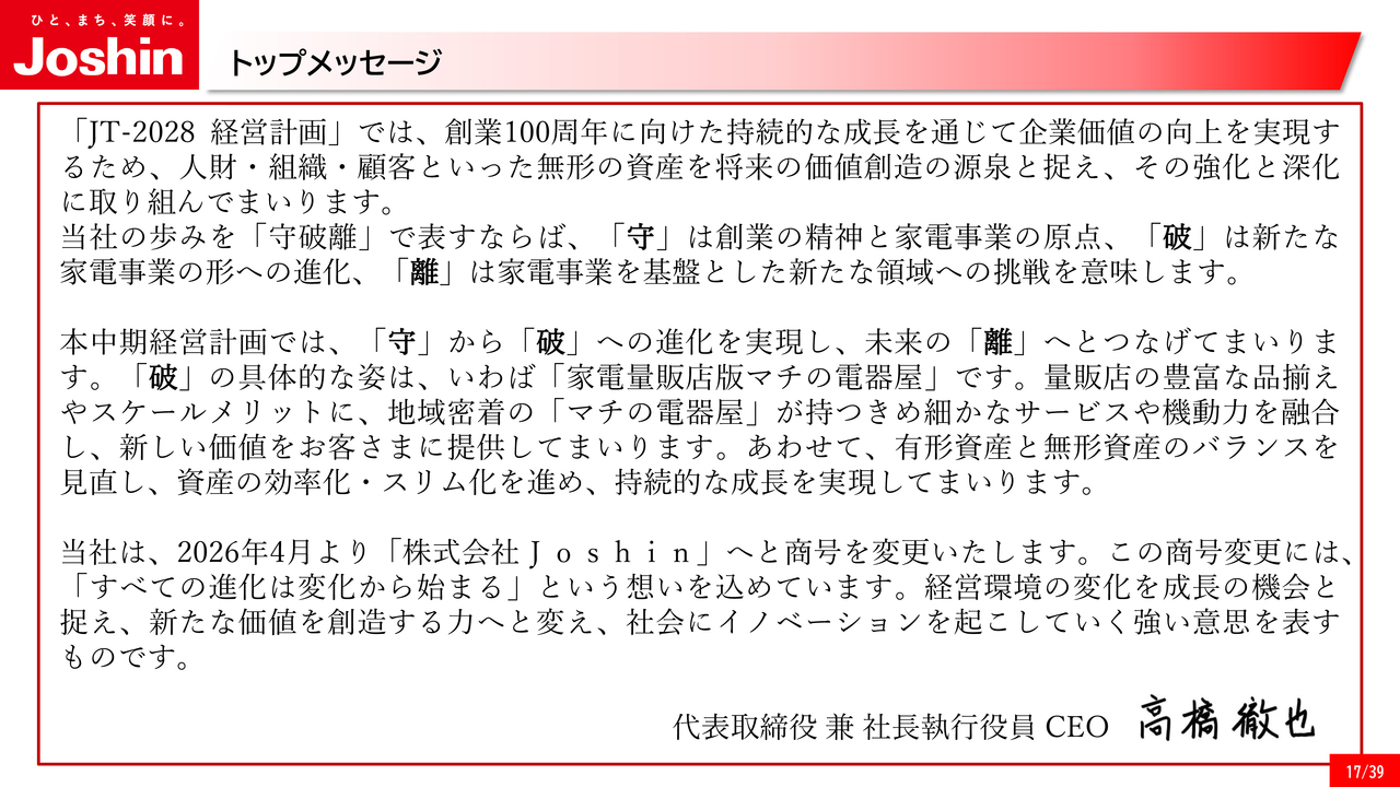 当社は、2026年4月より「株式会社Joshin」へと商号を変更します。この商号変更には、「すべての進化は変化から始まる」という想いを込めています。経営環境の変化を成長の機会と捉え、新たな価値を創造する力へと変え、社会にイノベーションを起こしていく強い意思を表すものです。