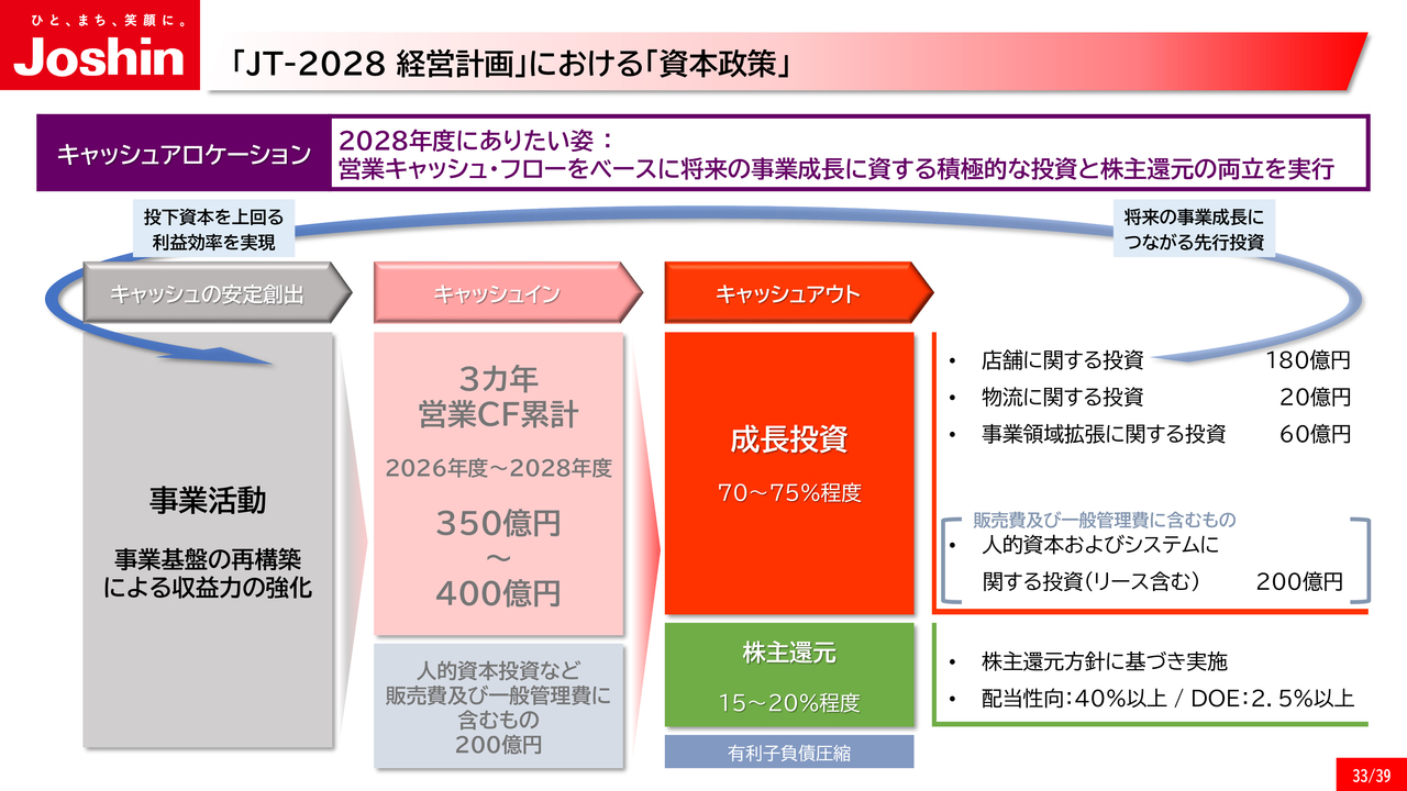新中計最終年度となる2028年度に、営業利益100億円を計上できるようになれば、3ヶ年の営業キャッシュフロー累計額の確保は可能と想定しています。