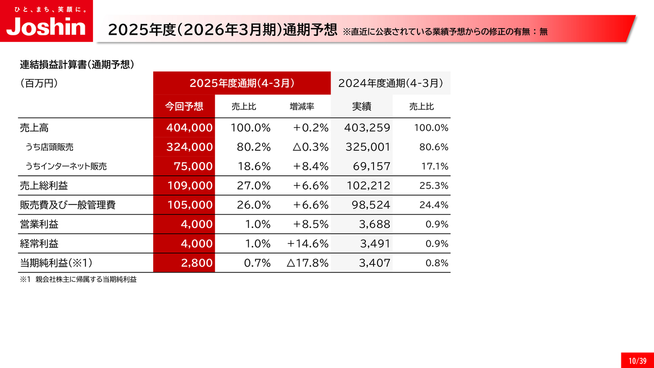 続いて10ページをご覧ください。ここからは、2025年度通期の予想をご説明します。
