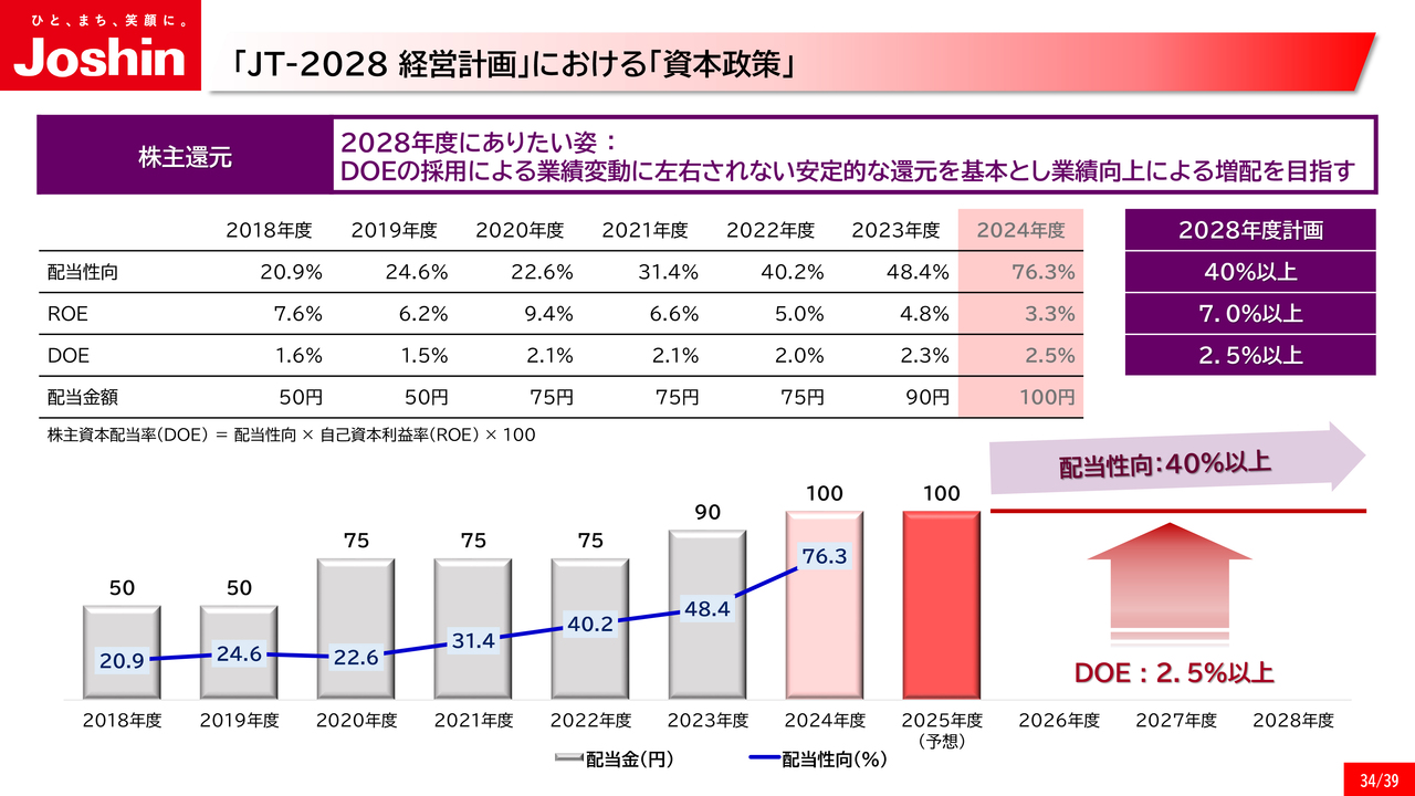 従来の「配当性向」に加え、「DOE、いわゆる株主資本配当率」を、新たな指標として導入しました。