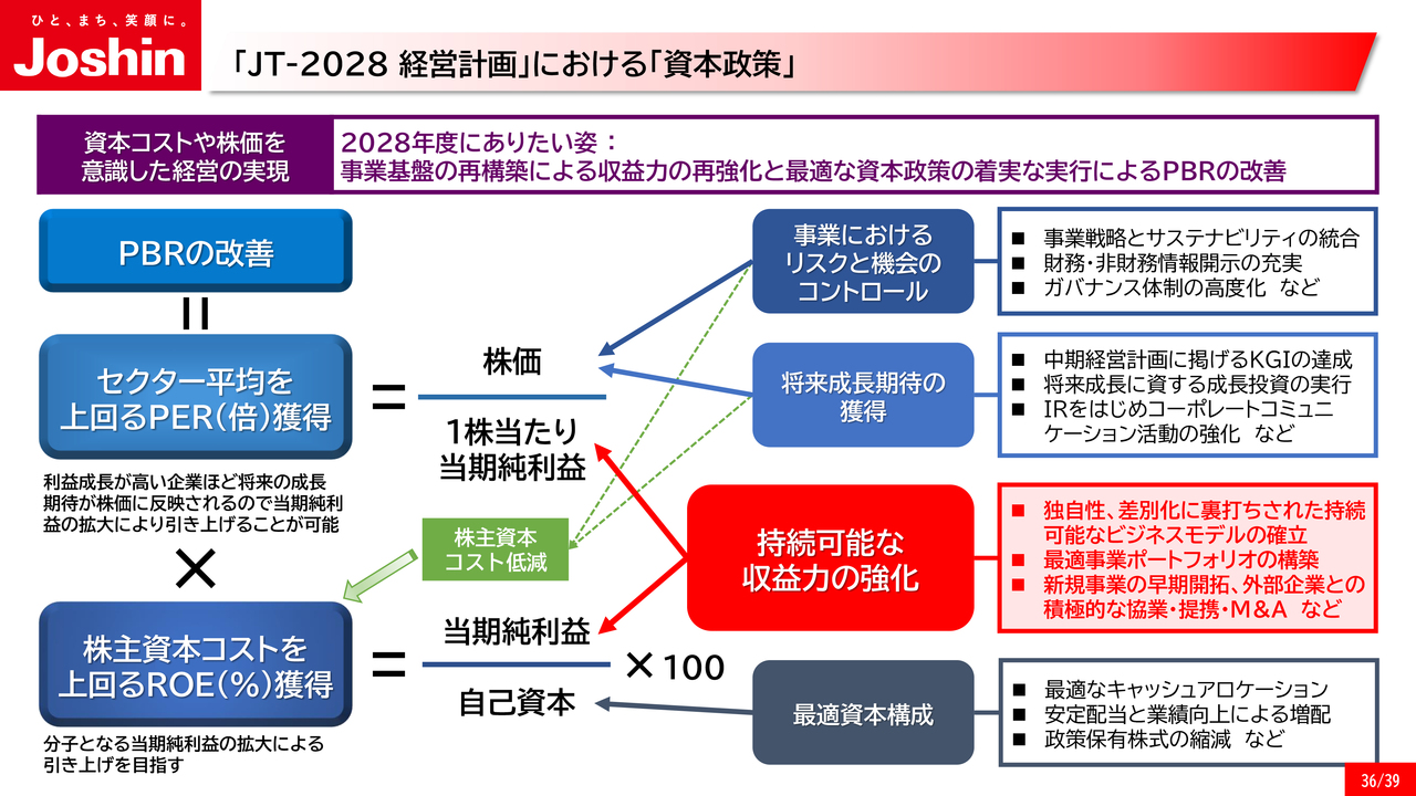 現在、0.6倍台で推移している「PBR」を引き上げるためには、収益性の向上、資産の効率的な運用、株主還元の強化、事業ポートフォリオの見直しなど、市場からの評価を高める取り組みが重要だと認識しています。