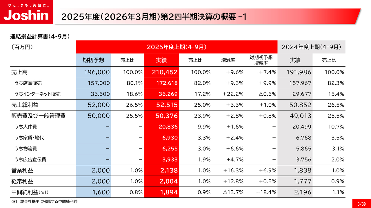 それでは3ページをご覧ください。3ページは2025年度上期、4月から9月の連結業績一覧です。