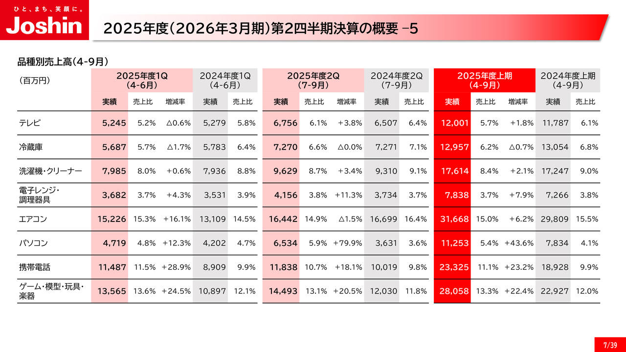 2025年度上期で見ると、「冷蔵庫」を除くすべての品種において、前期を上回る実績を確保しました。