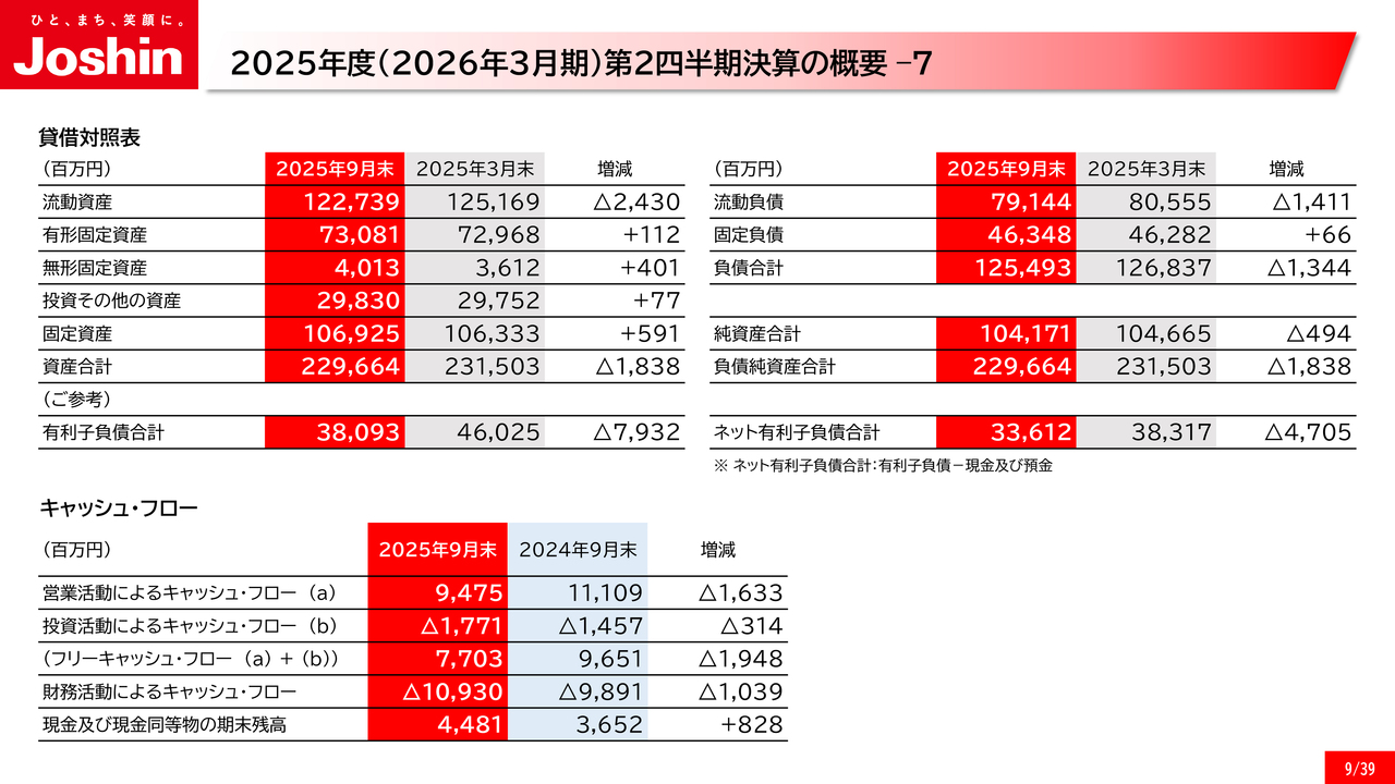 続いて9ページをご覧ください。貸借対照表とキャッシュ・フロー計算書における主要項目の実績です。