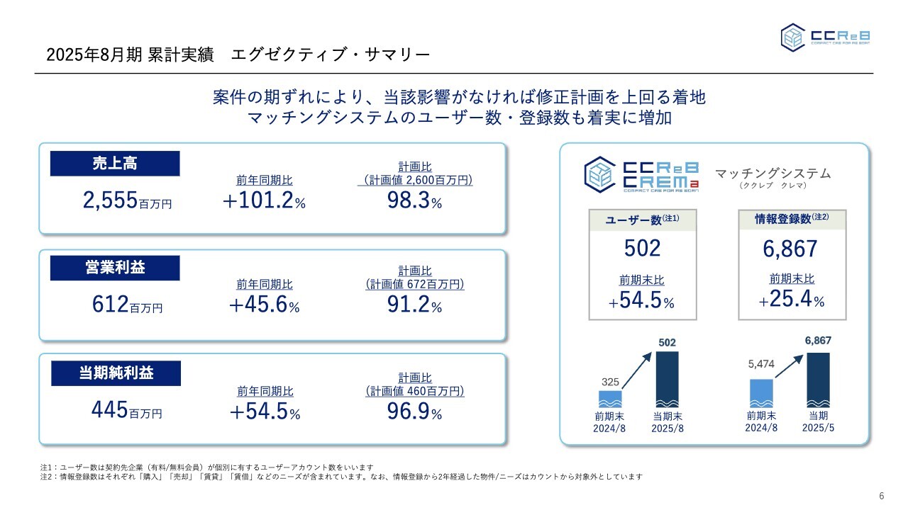 また、当社のエンジンであるマッチングシステム「CCReB CREMa(ククレブクレマ)」のユーザー登録数も着実に増加している状況です。