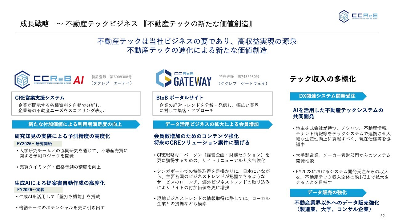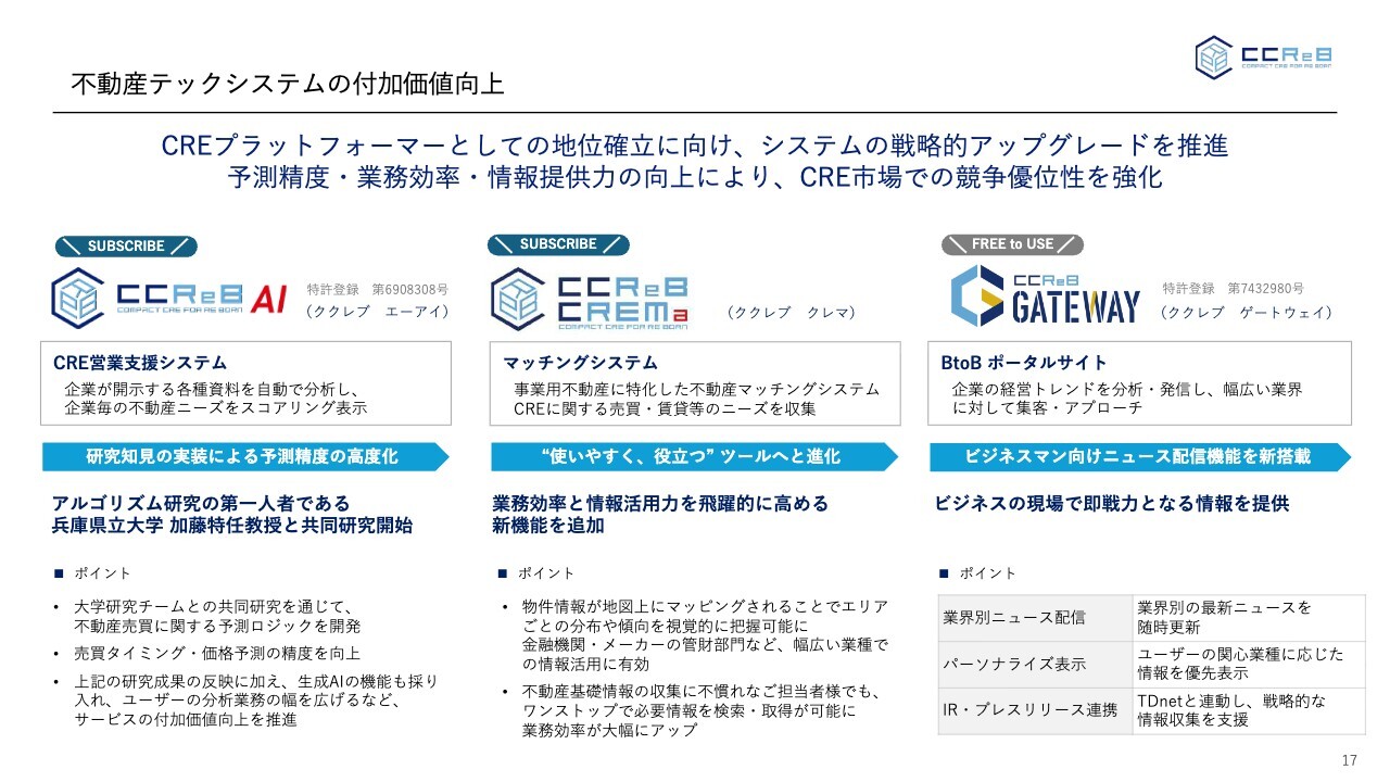 現在、不動産テックシステムの付加価値向上を進めています。当社はCREプラットフォーマーとして、このシステムのアップグレードを推進しています。具体的には、既存のサブスクリプションサービス「CCReB AI(ククレブエーアイ)」において、AIを活用し売却や取得のロジックをさらに磨くため、大学の研究メンバーと共同研究を開始しました。