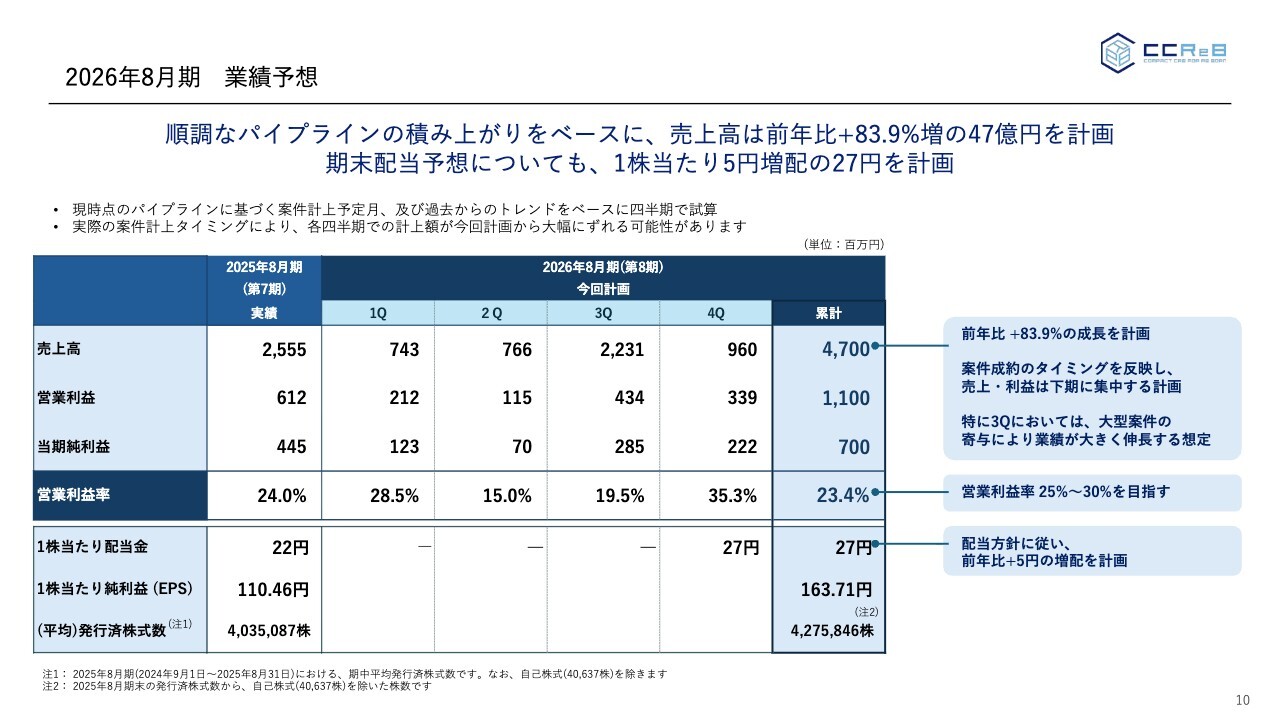 そのような状況を踏まえ、来期、2026年8月期(第8期)の業績予想として売上高47億円、営業利益11億円、当期純利益7億円を見込んでいます。配当については、1株当たり27円を予定しています。