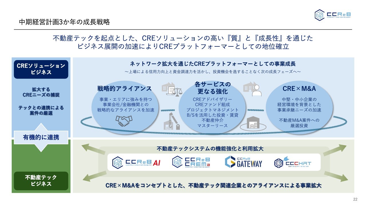 「成長戦略」については、今お話ししたM&Aを含めた部分については、CREソリューションビジネスだけでなく、不動産テックビジネスも含めた領域においてM&Aを活用し、インオーガニックな成長の実現を目指していきます。