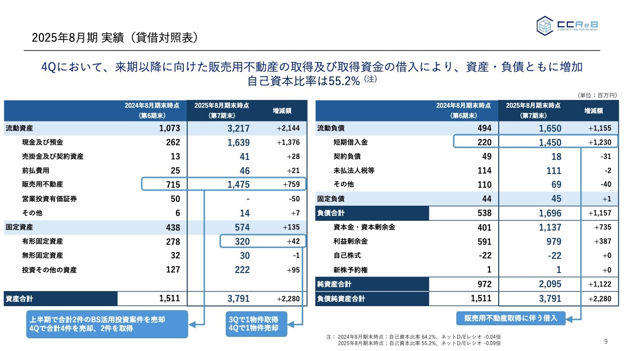 貸借対照表についてご説明します。8月にプレスリリースで発表したとおり、北海道北広島市の不動産を借入を活用して取得したことにより、第4四半期末で資産・負債ともに増加しています。