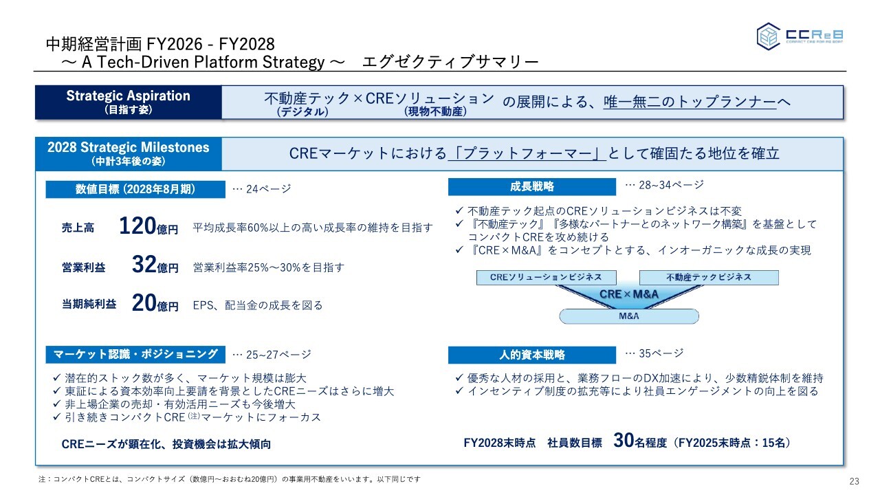 中期経営計画のエグゼクティブ・サマリーです。不動産テックとCREソリューションの展開により、唯一無二のトップランナーを目指していきます。その中で、CREマーケットにおけるプラットフォーマーとしての確固たる地位を確立する3年間としています。