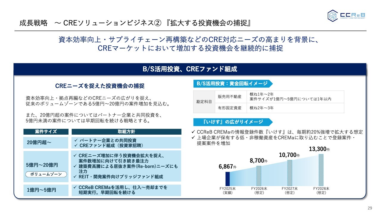 5億円以下、特に1億円から5億円の規模については「CCReB CREMa」を活用してマッチングを行い、付加価値を付けて早期に売却することによる短期回転型の案件を進めていきます。販売用不動産の保有期間は、長くても2年、小規模案件については1年以内で回転し、当社の資本効率を向上させる方針です。