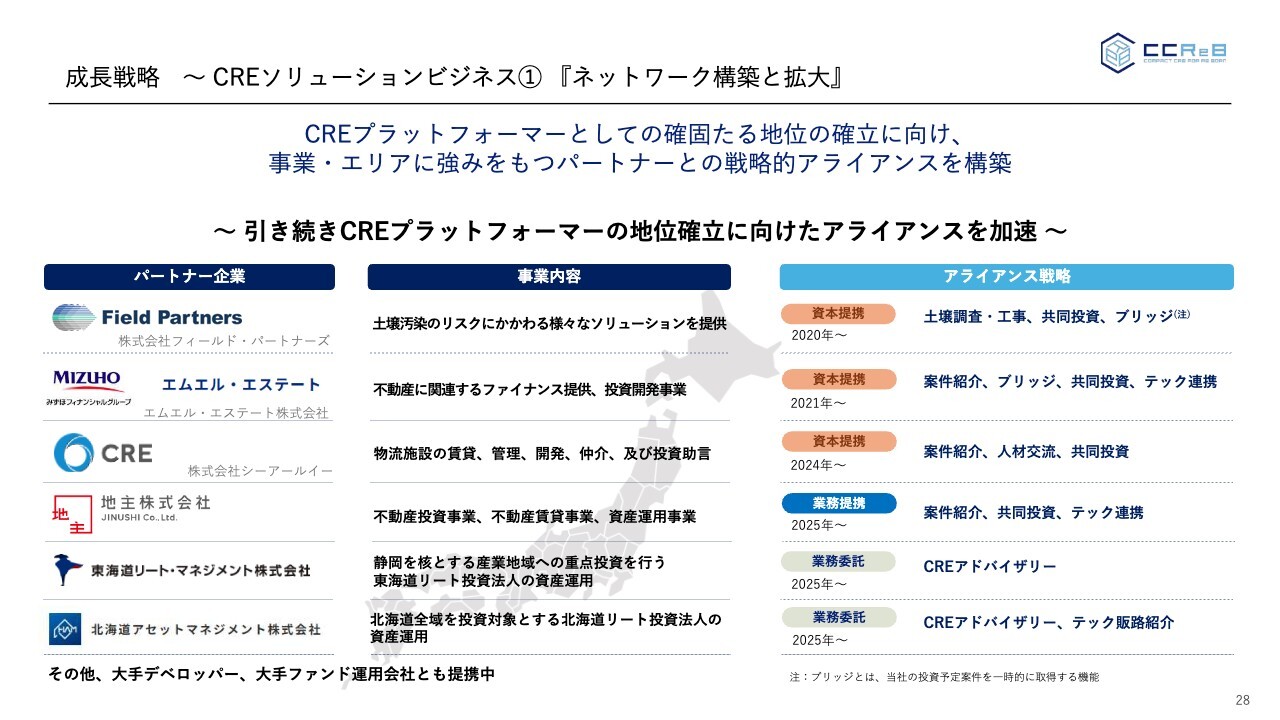 このような事業環境の中で、ネットワークの構築も進めています。これまでも大手デベロッパーやファンドとは、CREにおける戦略的提携を行っています。スライドには、その中のパートナー企業を抜粋しています。