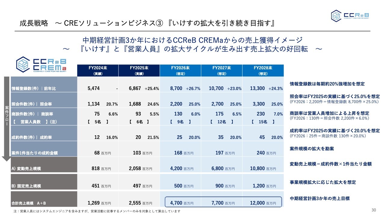 この実現のため、当社としては「いけす」を拡大させる方針です。それを「いけす」から案件を取り上げていく営業人員の規模が非常に重要であり、これを拡大することで好回転のサイクルにつなげます。この2点をこの3年間を推進していくため、引き続き「いけす」の拡大を目指す成長戦略を掲げています。