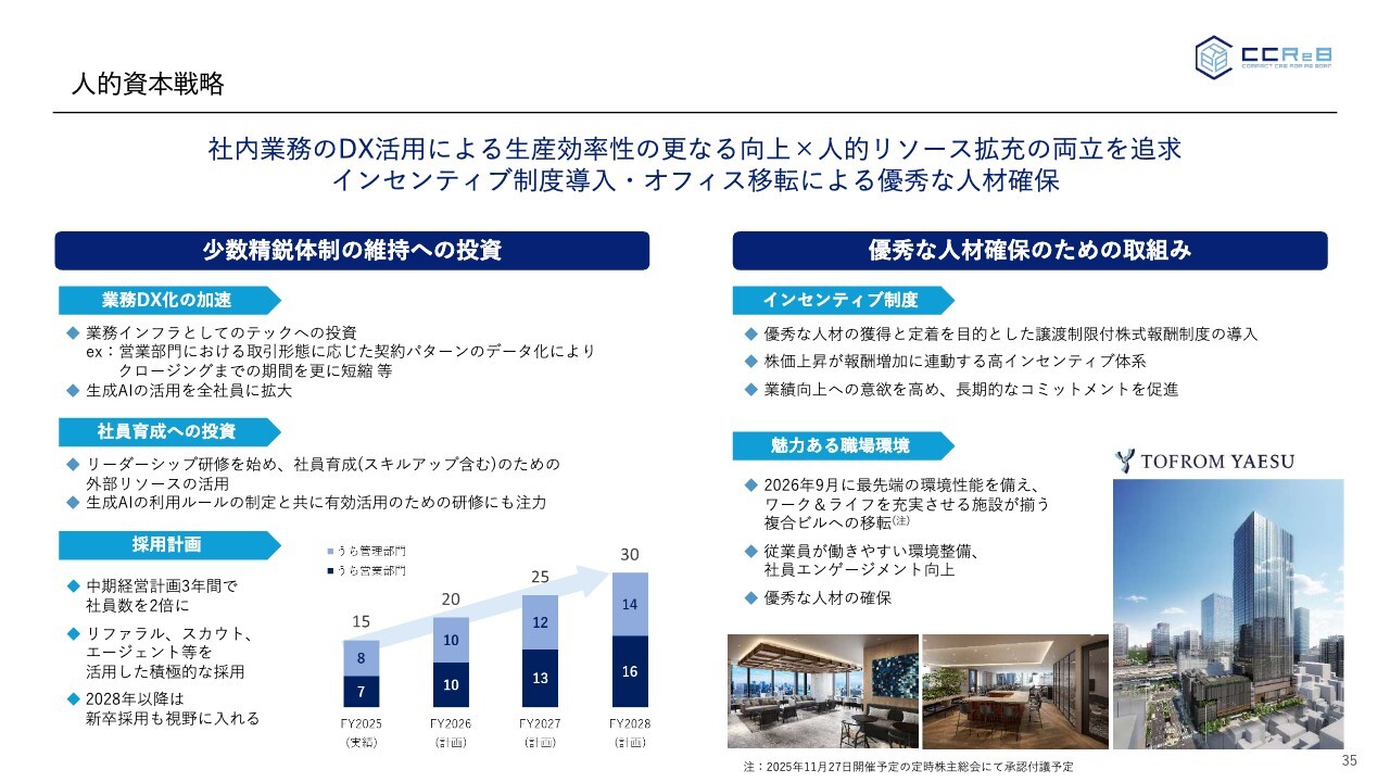 また、本日公表した内容として、インセンティブ制度の充実等により社員のエンゲージメント向上を図ることを計画しています。この施策を踏まえ、2028年度末には現在の倍となる社員数30名を目標としています。