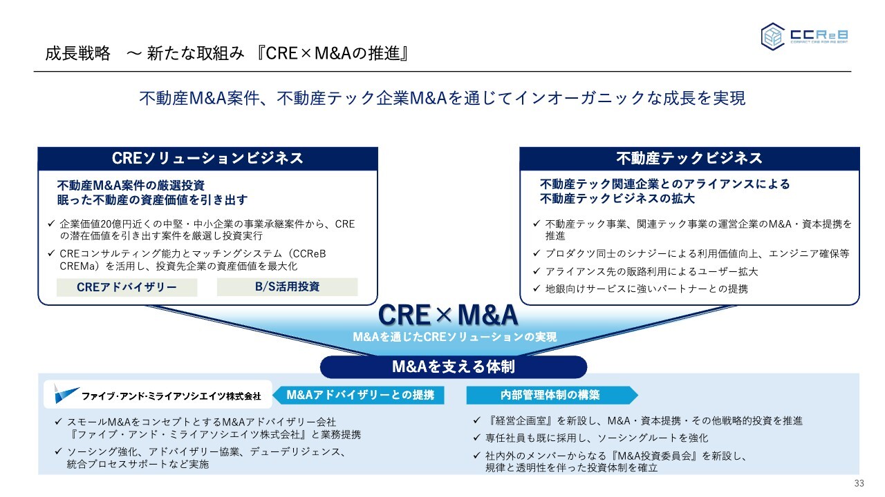 そのためにも、この「CRE×M&A」という観点から、ファイブ・アンド・ミライアソシエイツ社との提携を進めるとともに、内部管理体制の一環として、M&Aを検討する投資委員会を新設します。この委員会には外部の専門家も交えて、規律をもって実行していきます。